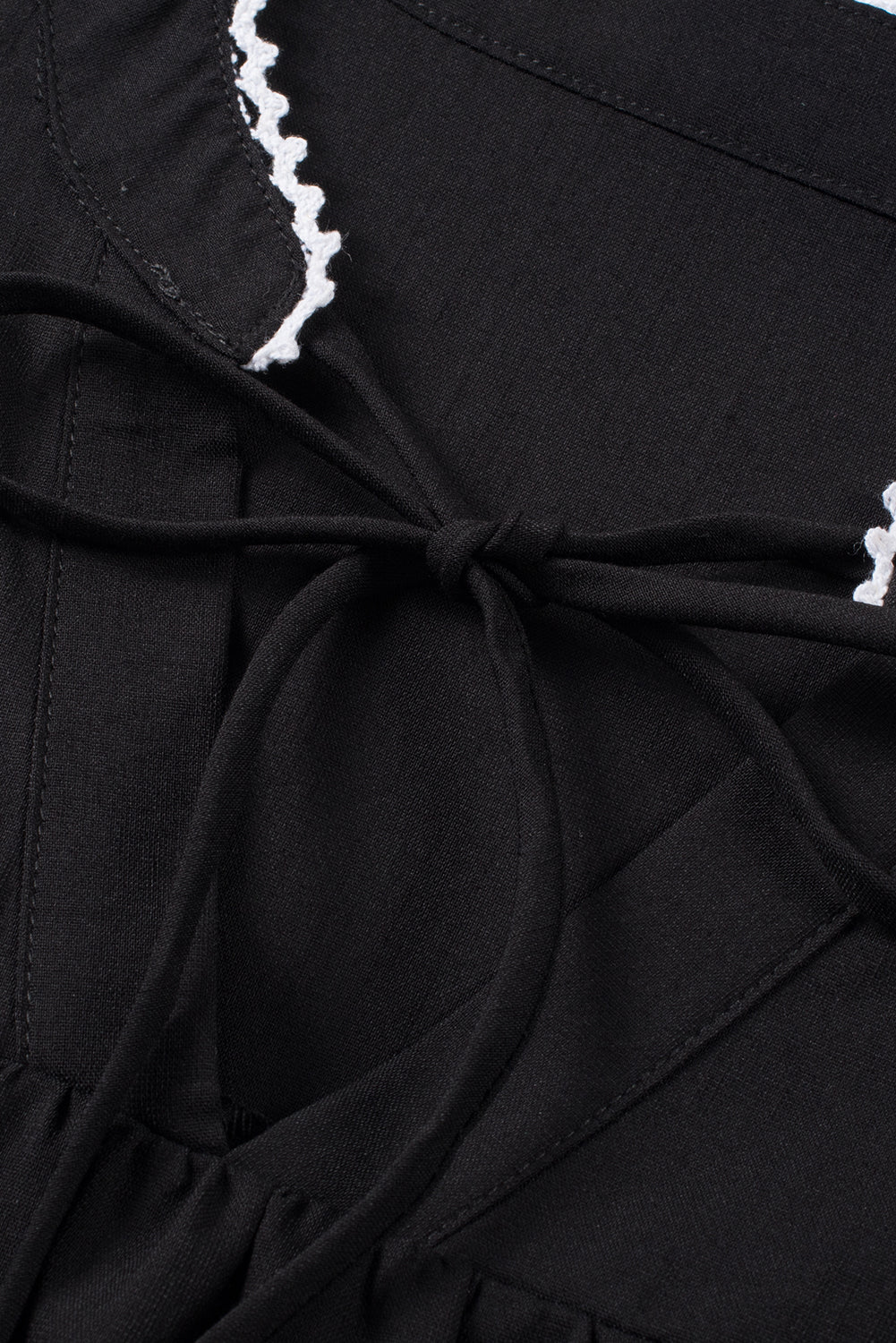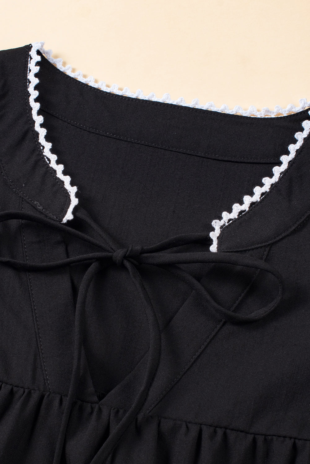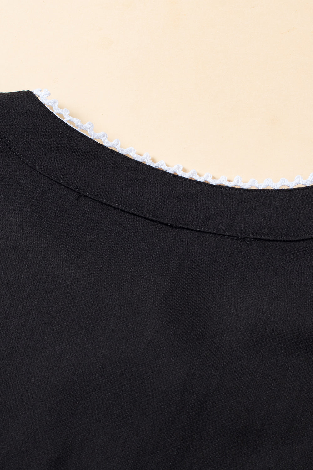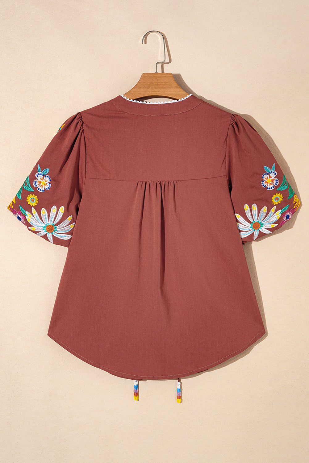 Black Floral Embroidered Puff Sleeve Split Neck Blouse