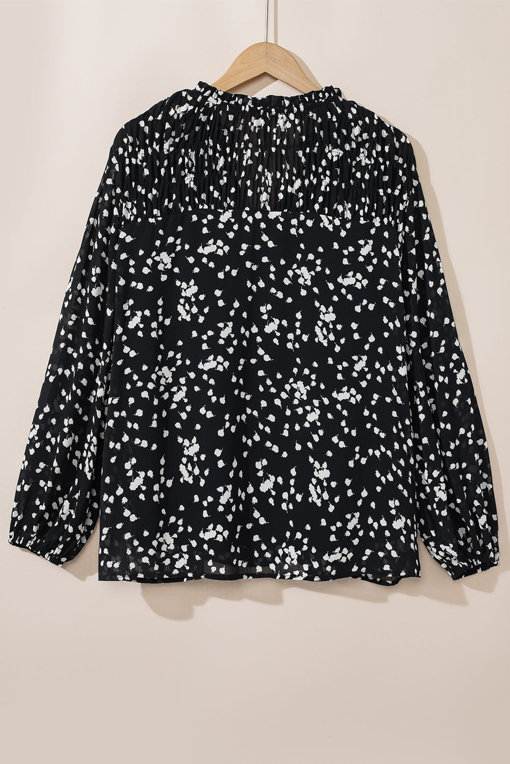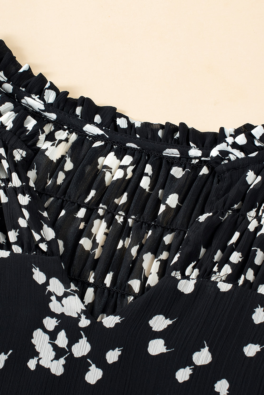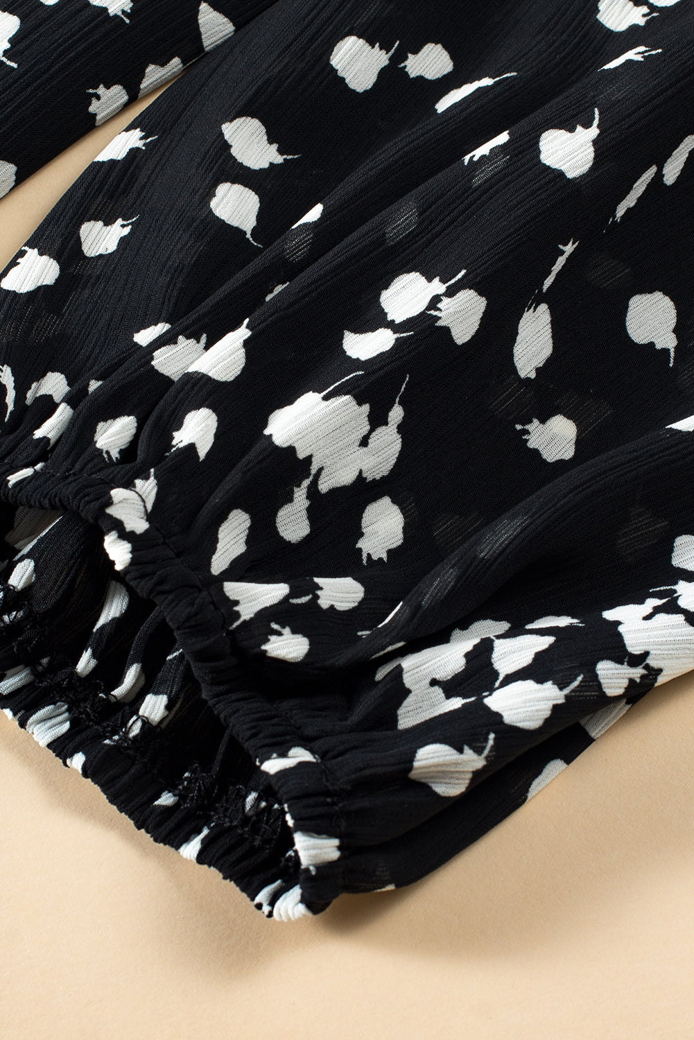 Black Plus Size Floral Print Ruched Split Neck Blouse