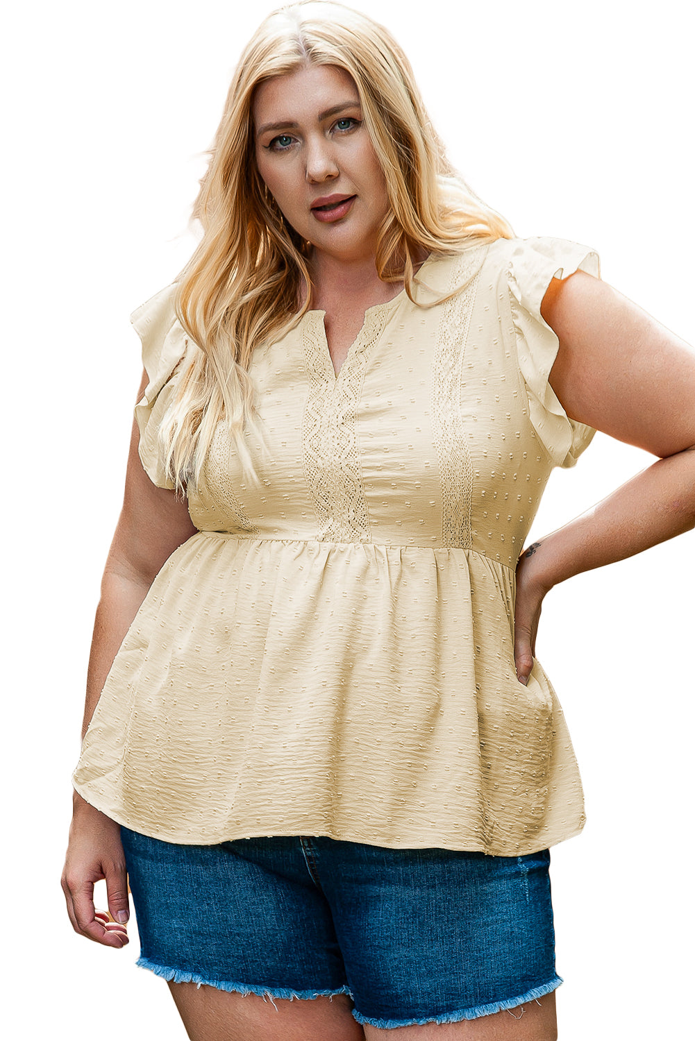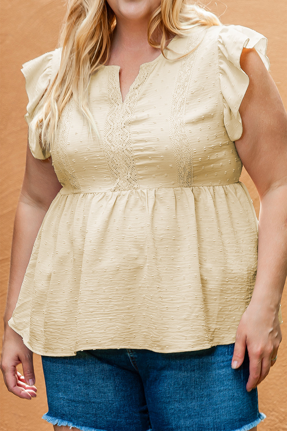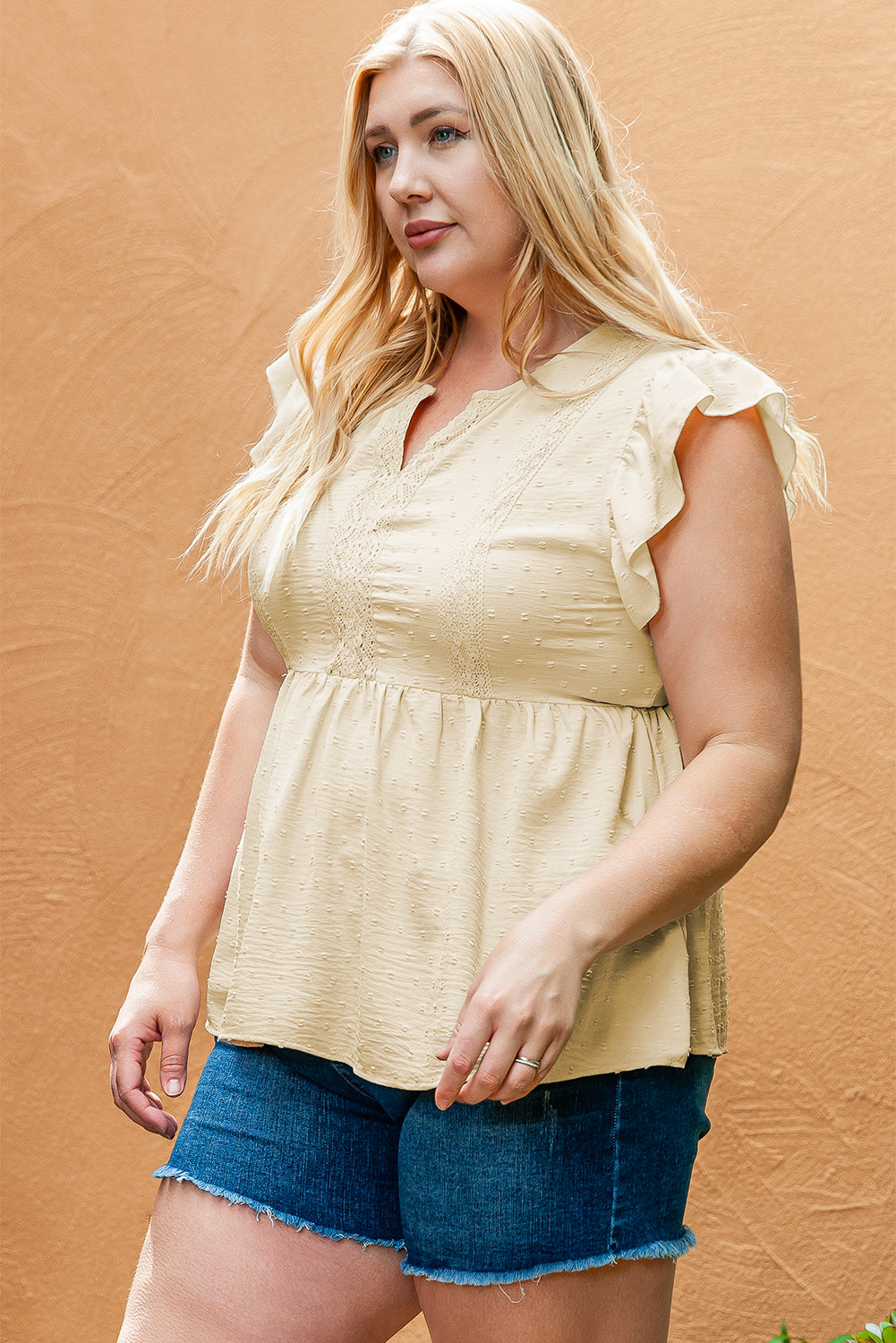 Golden Fleece Plus Size Swiss Dot Lace Trim Split Neck Babydoll Top