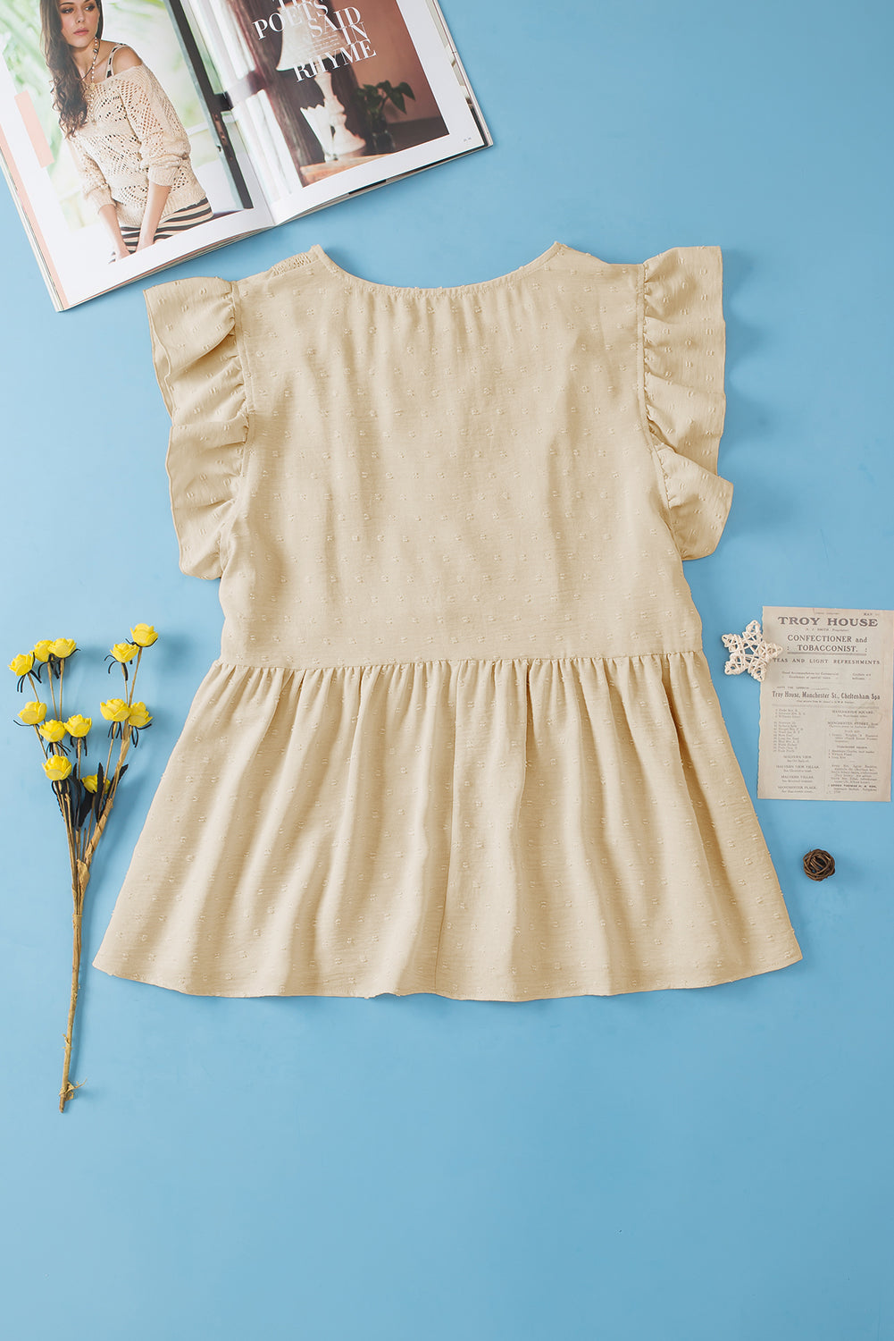 - Delicate ruffled flutter sleeves create a feminine and playful look