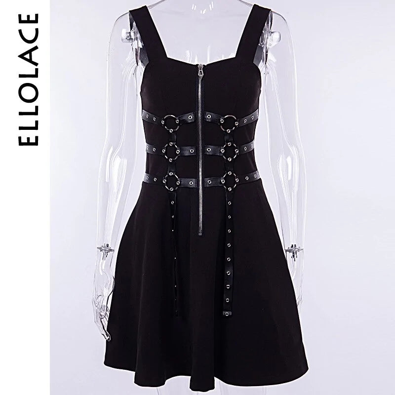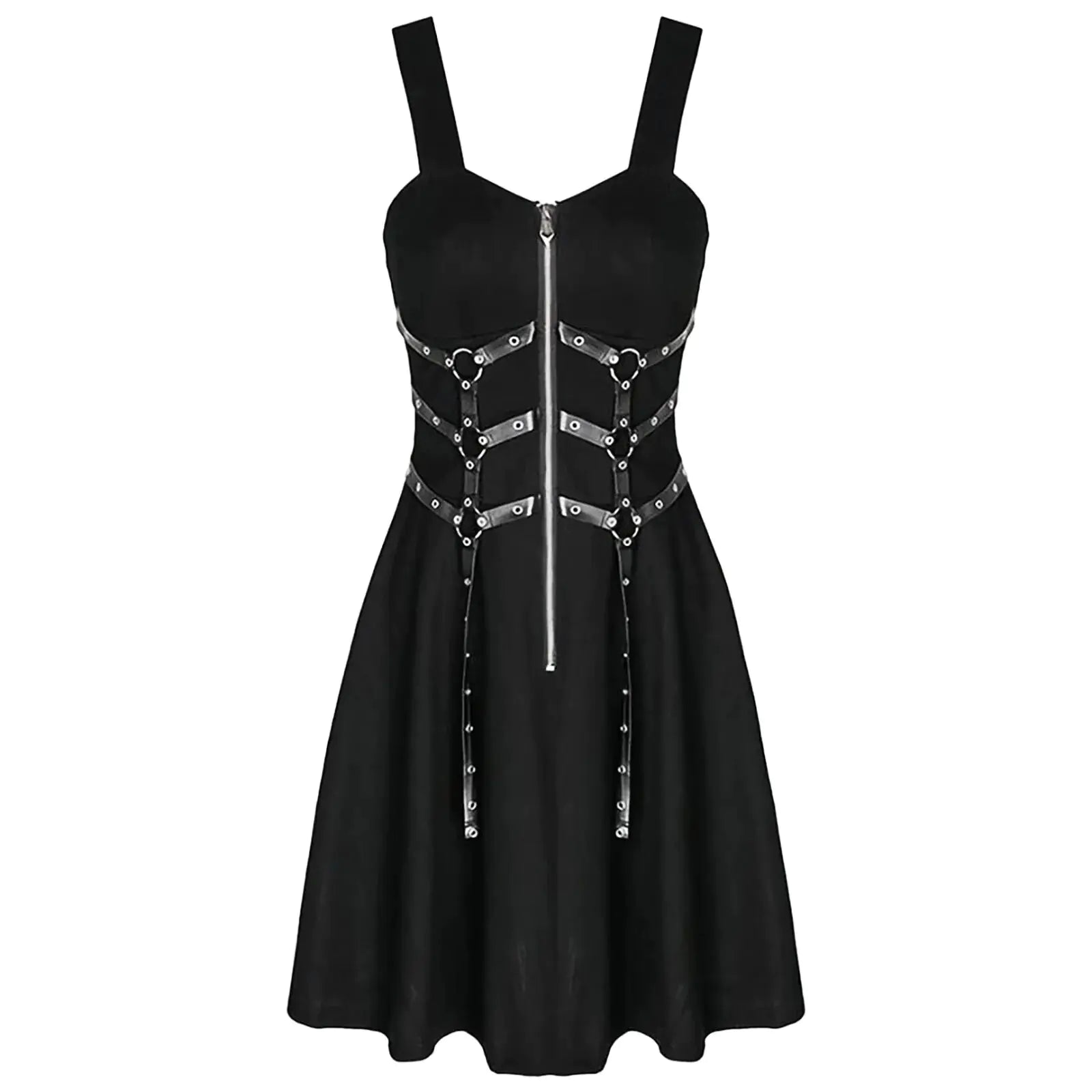 But what sets this dress apart is its edgy chest PU eyelet web zipper detail, adding a touch of punk rock flair to your ensemble. Whether you're hitting the beach, attending a music festival, or simply enjoying a day out with friends, this mini dress is sure to turn heads and make a statement.