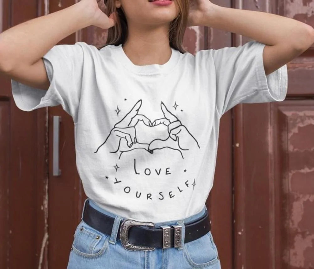 Whether you're lounging at home, meeting friends, or running errands, our "Love Yourself" T-shirt is your go-to choice for a comfortable and stylish outfit. Wear it as a reminder to always appreciate who you are, or gift it to someone special as a symbol of your admiration and support.