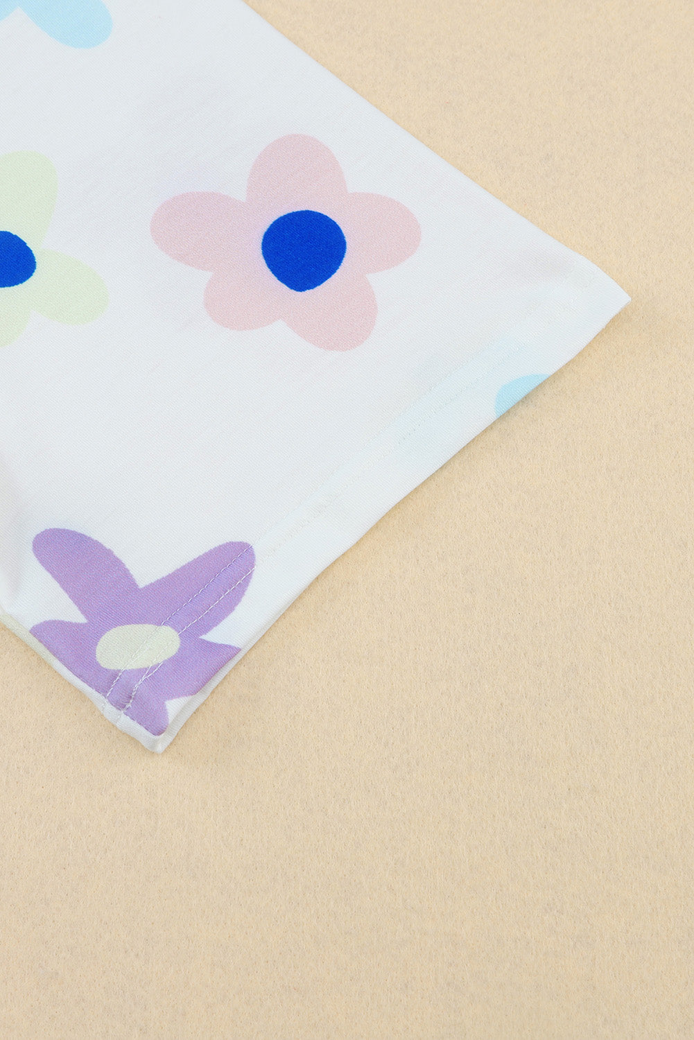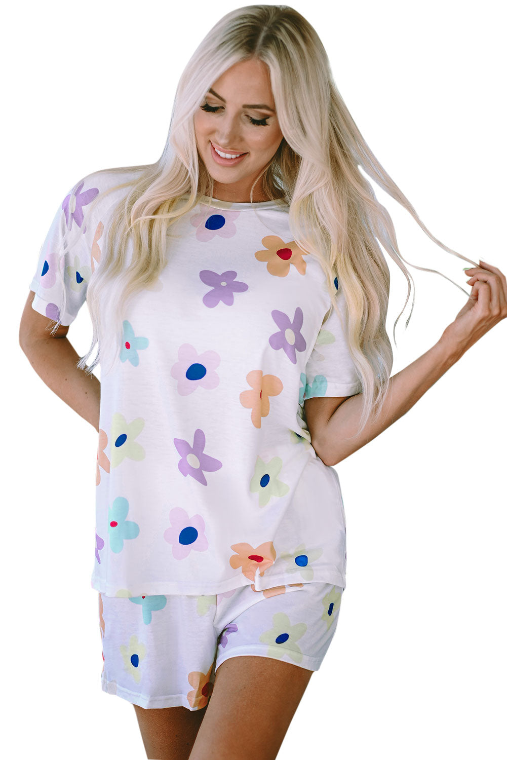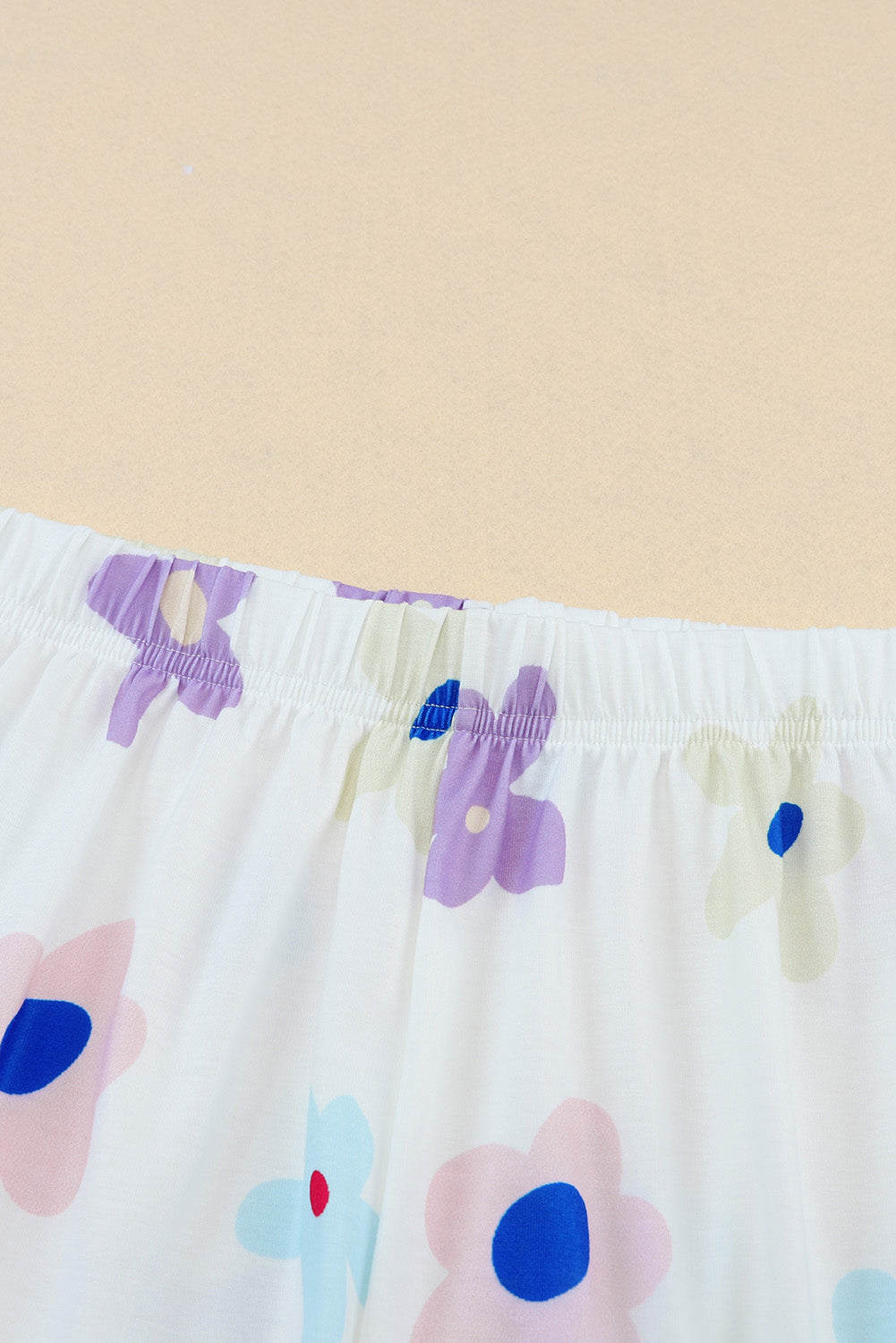 Pink Flower Print Short Sleeve High Waist Two Piece Shorts Set