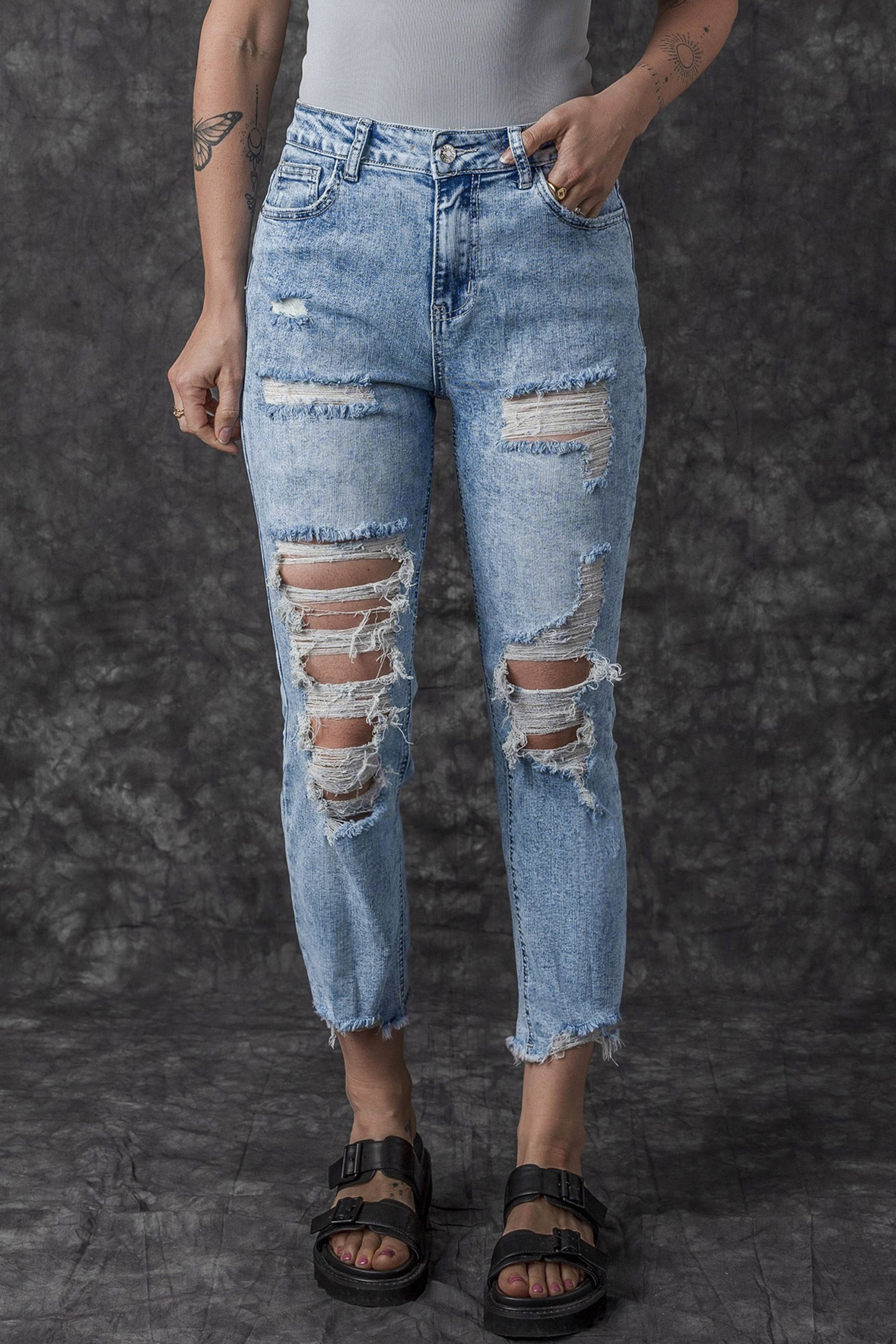 Sky Blue Acid Wash Distressed Slim Fit Jeans