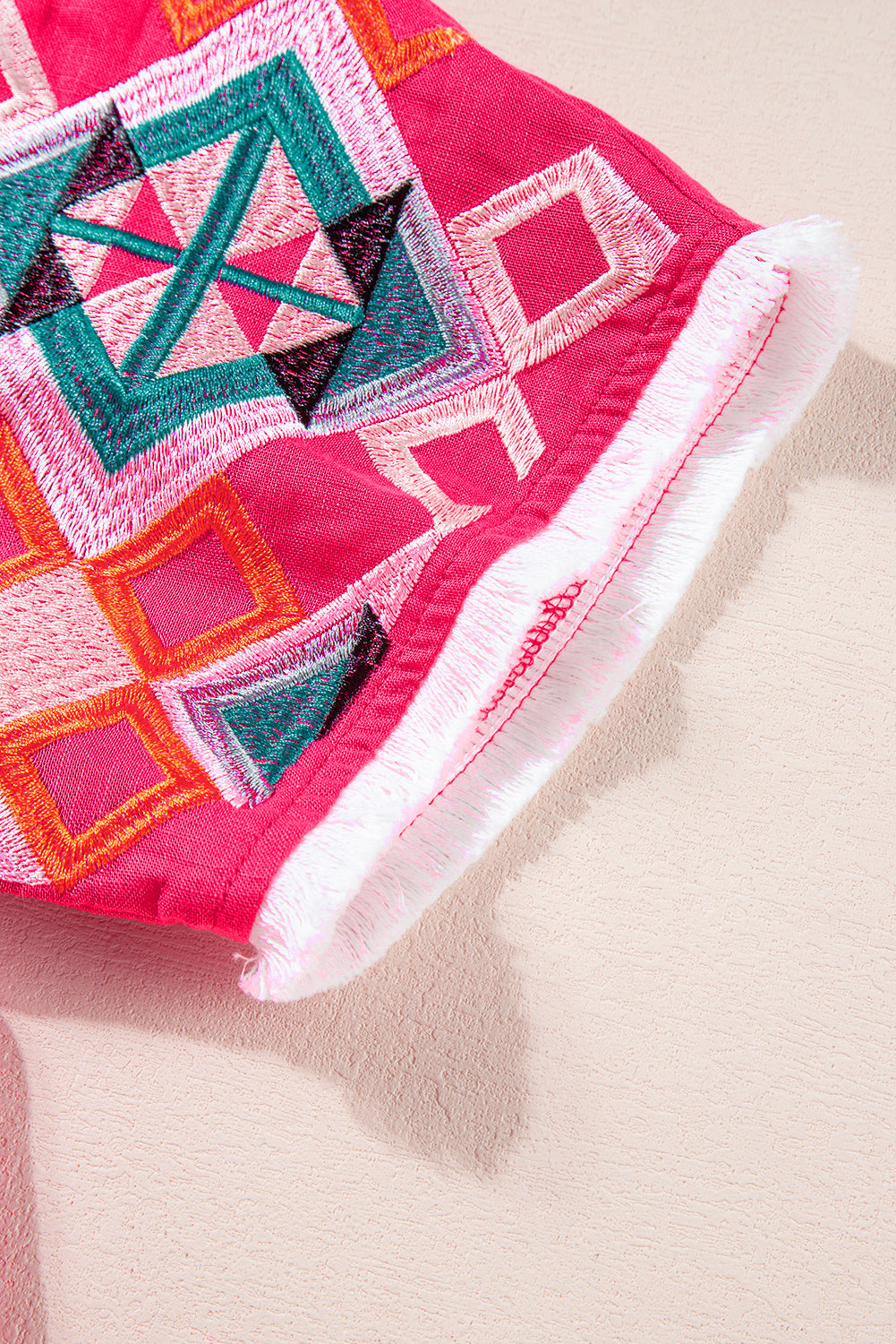 Strawberry Pink Geometric Embroidered Tassel Tie V Neck Blouse