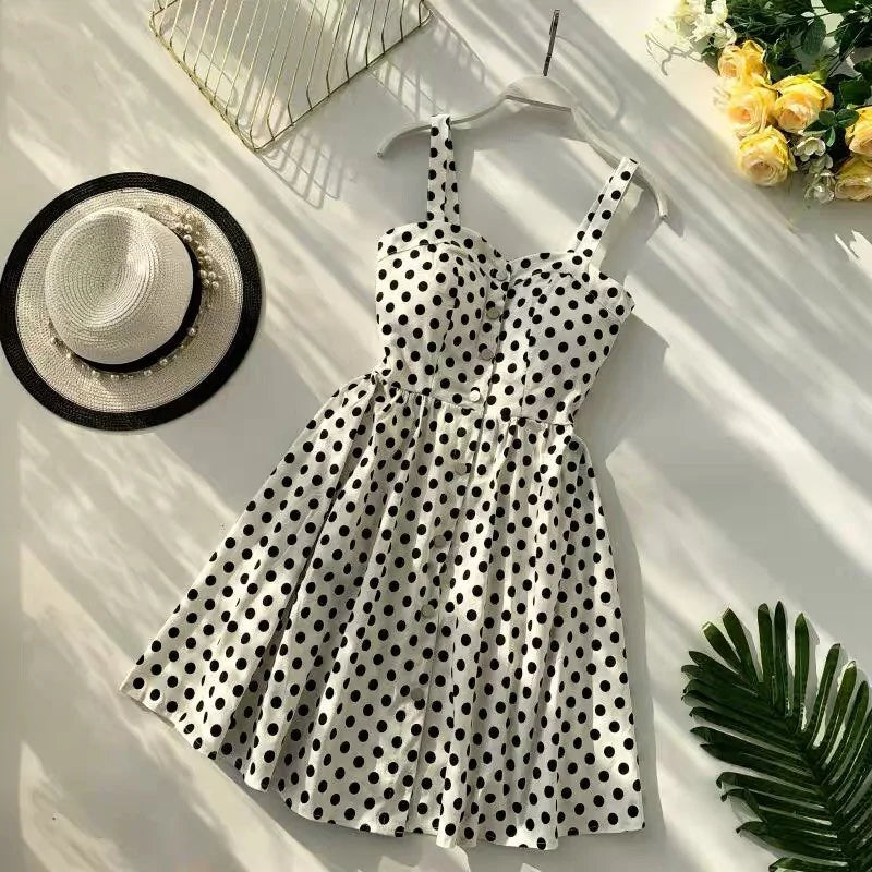 Introducing our latest summer sensation, the Cotton Zipper Halter Dress! Crafted with comfort and style in mind, this dress is a perfect blend of fun and professionalism, ensuring you're always ready for any occasion.Made from high-quality cotton, this dress offers a breathable and lightweight feel, keeping you cool and comfortable even on the hottest summer days. The fitted and flared silhouette accentuates your natural waistline, providing a flattering and feminine look that's both elegant and playful.Featuring a chic halter neckline and spaghetti straps, this dress exudes effortless charm and sophistication. The decorative zippers add a touch of edgy flair, elevating your ensemble with a modern twist.Whether you're heading to a casual daytime outing or a stylish summer soirée, this dress is sure to turn heads. Its versatile design and knee-length hem make it perfect for any occasion, while the playful point pattern adds a fun and youthful vibe to your look.Make a statement this summer with our Cotton Zipper Halter Dress. Embrace comfort, style, and confidence with every step you take!