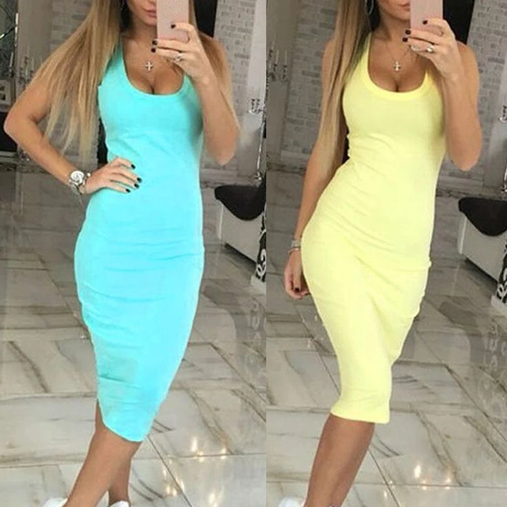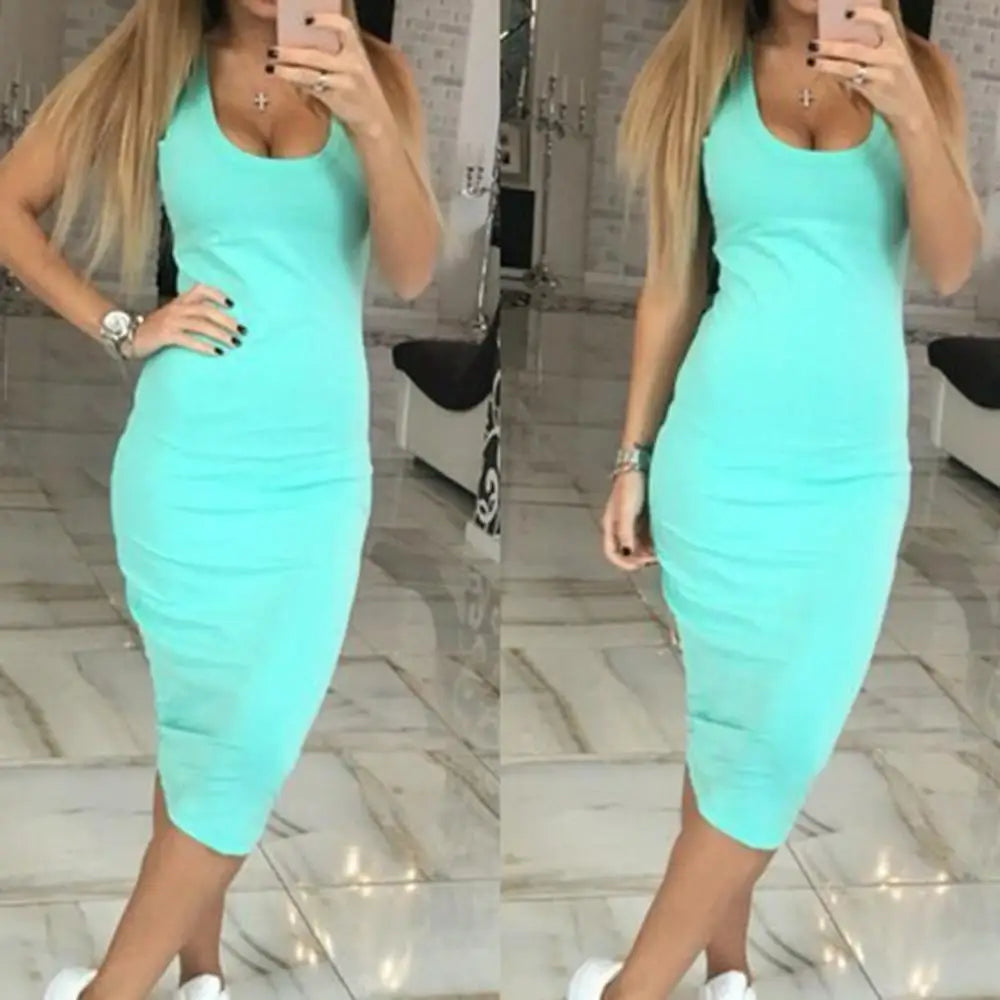 Summer Party Solid Color U Neck Sleeveless Slim Fit Bodycon Pencil Dress